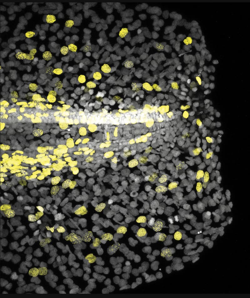 Zebrafish larval fin at 2 days-post-fertilization, 1 hour after cutting, with immunostainings labeling the nucleus of proliferative cells (yellow, EdU+) and all cells (grey, DAPI+). © Elisa Nerli