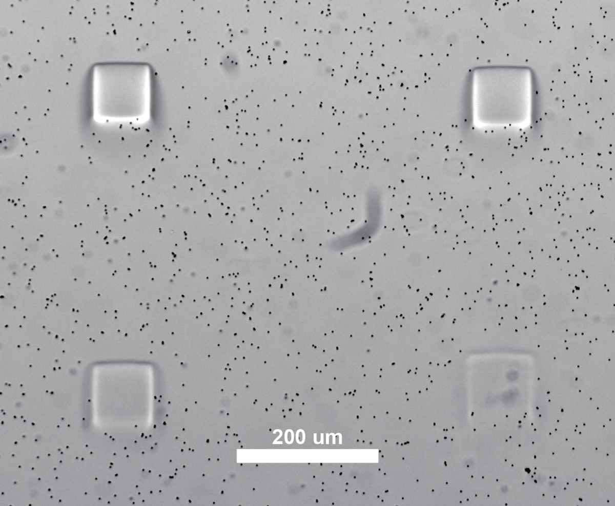 Widefield fluorescence imaging of optically trapped, DNA-coated beads. Image by Franziska Lesche (Brugues group)