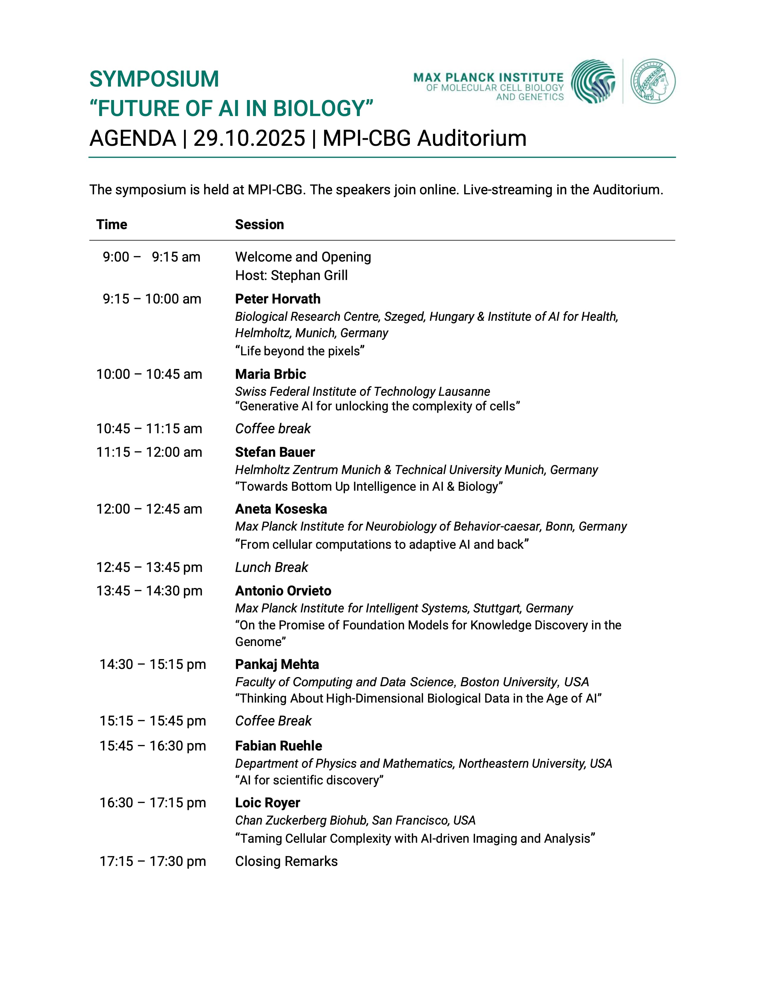 news-1565 Mon, 27 Oct 2025 10:17:31 +0100 Future of AI in Biology https://www.mpi-cbg.de/news-outreach/news-media/article/syposium-future-of-ai-in-biology Symposium on October 29 at the MPI-CBG On October 29, 2025, the Max Planck Institute of Molecular Cell Biology and Genetics (MPI-CBG) will hold a symposium titled "Future of AI in Biology." Leading scientists and researchers will come together at this event to discuss the most recent developments and emerging areas of AI research and applications in biology. The day will include talks from a wide spectrum of AI research on the most recent developments, innovative methods, and potential paths forward.