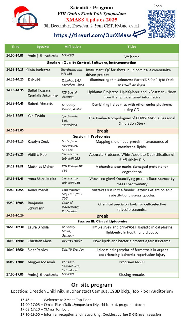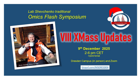 XMass Updates is an informal get-together with our collaborators, alumni, and the Dresden MS Community in December. Launched in 2018, this one-day symposium provides an opportunity to reflect on the year's exciting developments in omics sciences, share new results and ideas, exchange the latest scientific news and foster future plans. The event comprises 14–15 flash talks, with two short breaks, and is held in a hybrid format. The event is open to other participants via Zoom, and registration is not required.